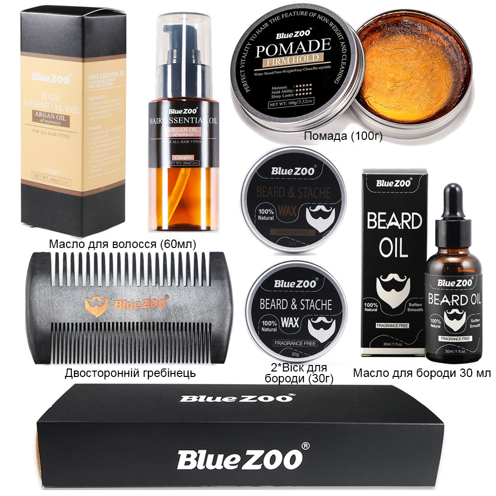 Що входить в набір для догляду за волоссям і бородою Blue Zoo 6 в 1: